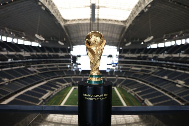 The FIFA World Cup trophy is displayed on the field of the Mercedes-Benz Stadium in Atlanta, Georgia. (Photo by Stew Milne/FIFA via Getty Images)
