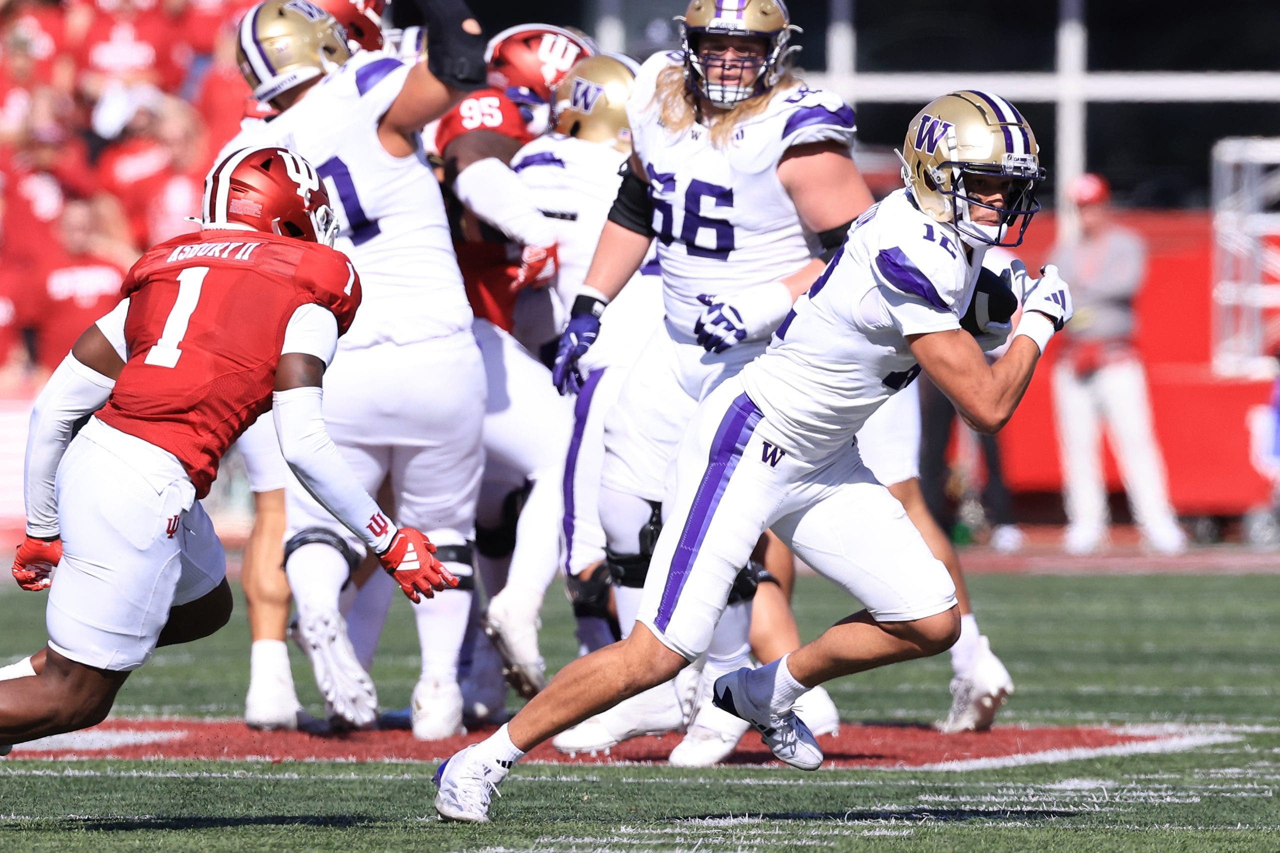 Denzel Boston #12 of the Washington Huskies is chased by Shawn Asbury II #1 of the Indiana Hoosiers. (Photo by Justin Casterline/Getty Images)