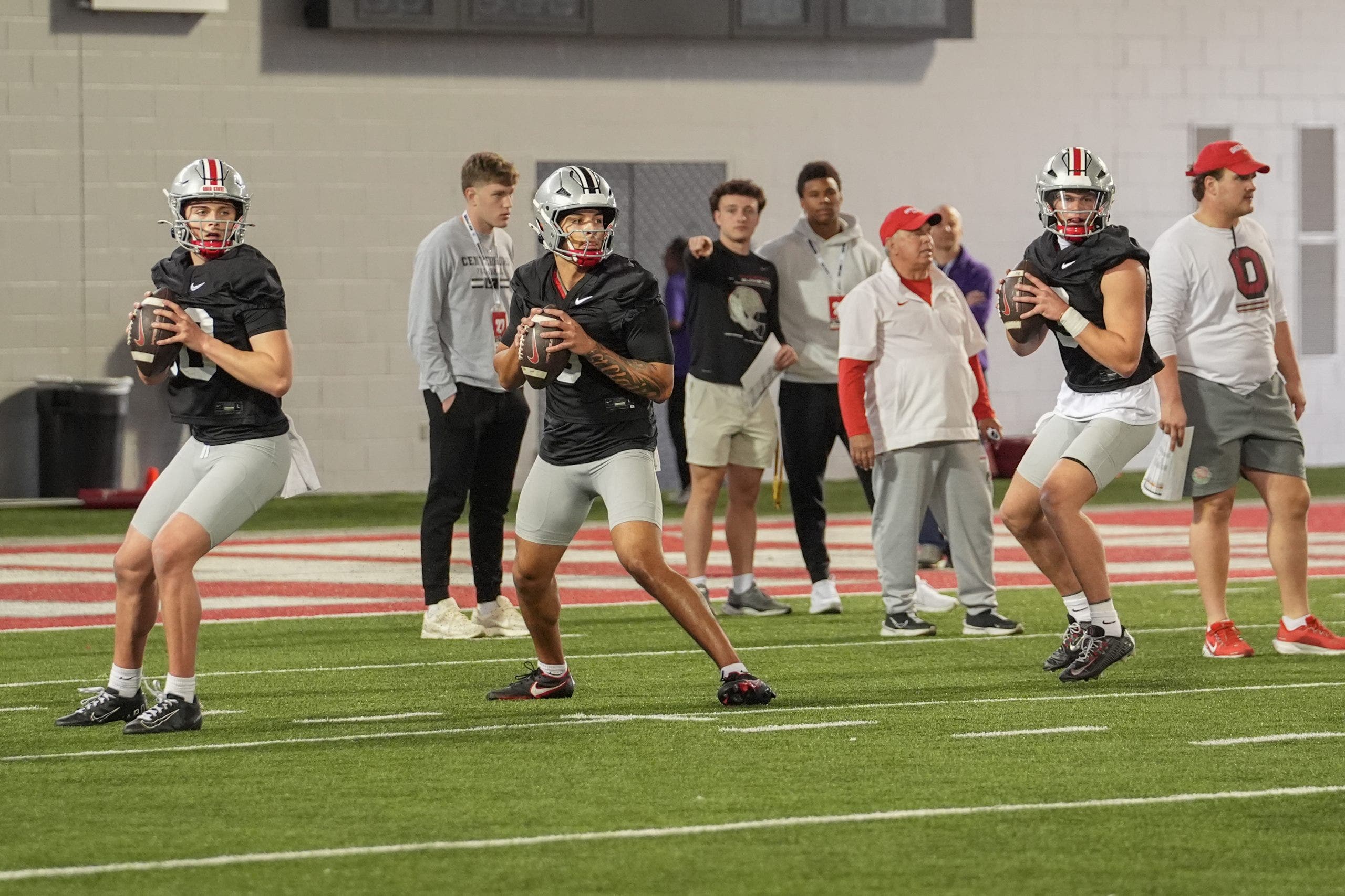 Julian Sayin #10, Tavien St. Clair #9 and Lincoln Kienholz #3 of Ohio State drop back to pass the ball during spring practice. (Photo by Jason Mowry/Getty Images)
