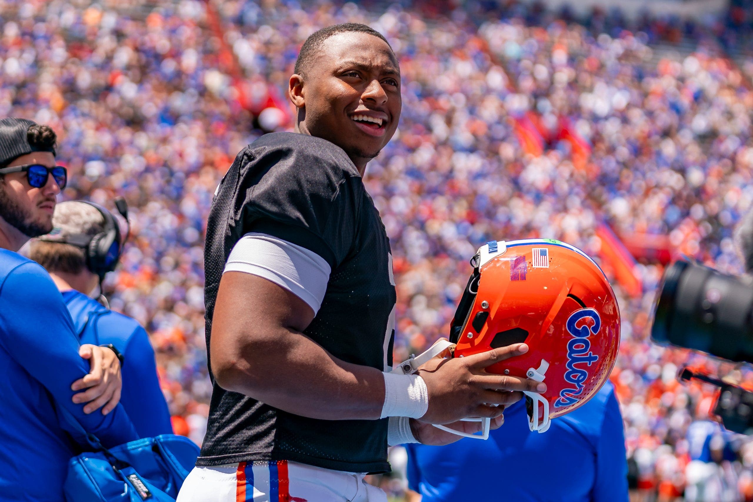Florida quarterback DJ Lagway (2) smiles on the sideline during the Florida Gators Orange and Blue Game. (Photo by Chris Leduc/Icon Sportswire via Getty Images)