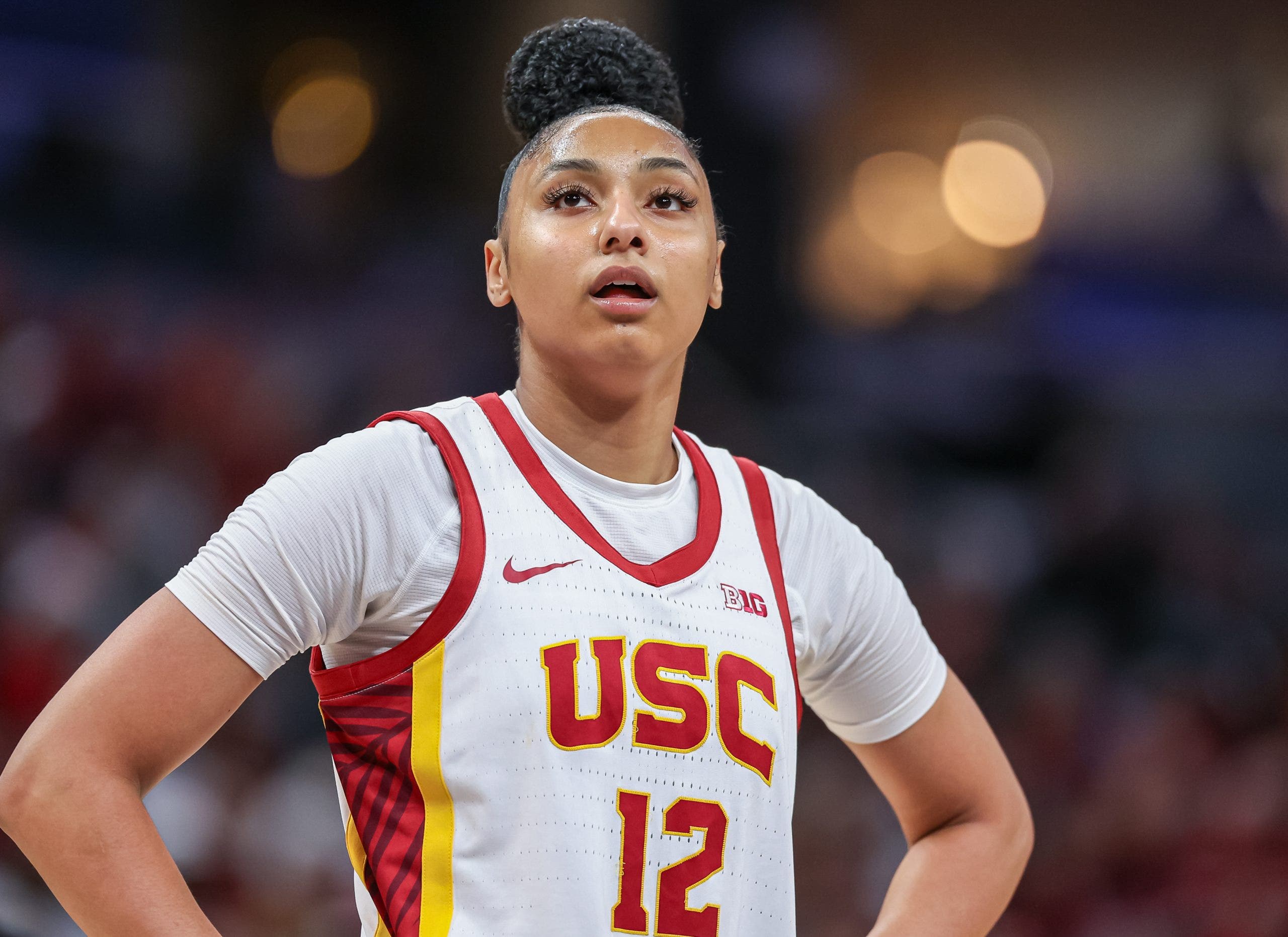 JuJu Watkins #12 of USC looks on during a game against Indiana in the Big Ten Women's Basketball Tournament. (Photo by Michael Hickey/Getty Images)