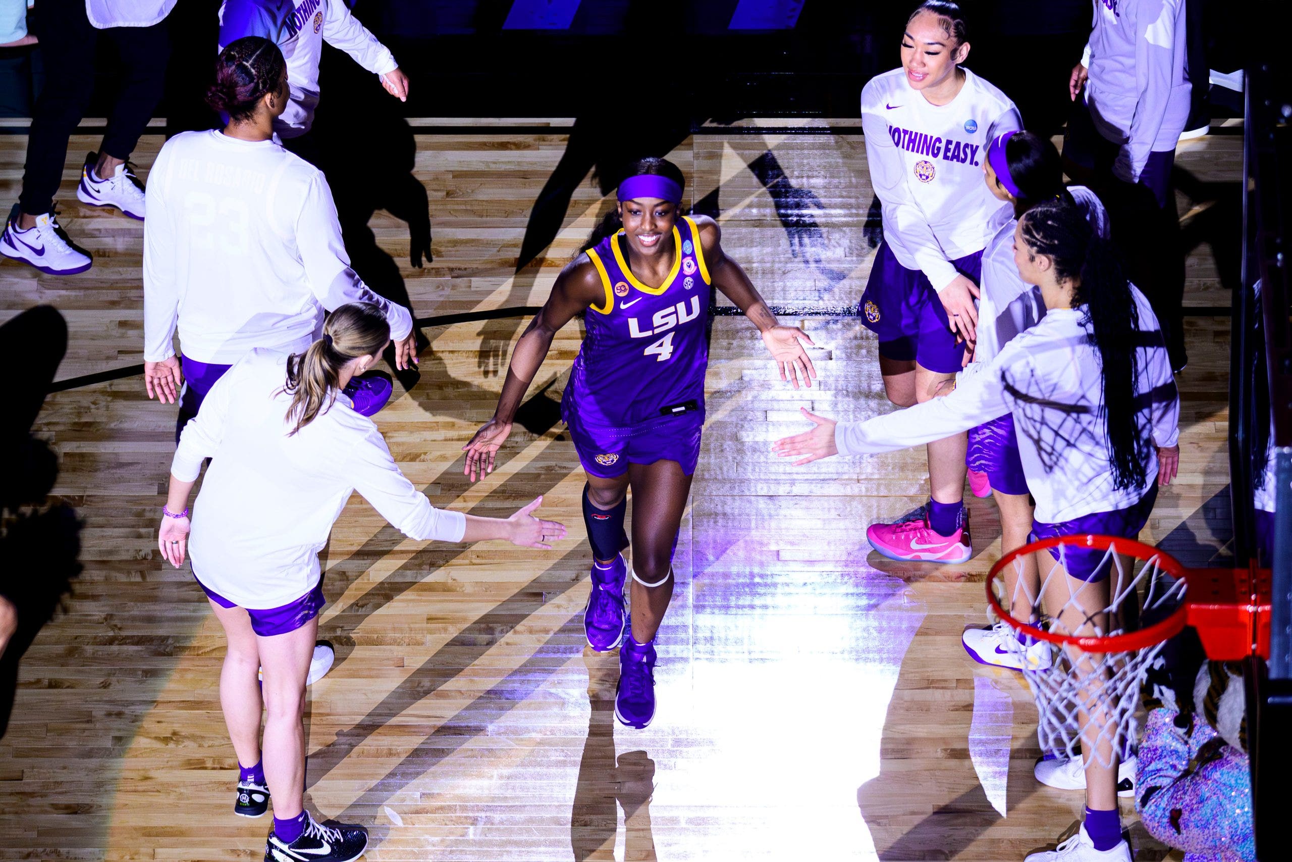 Flau'jae Johnson #4 of the LSU Tigers pregame against the UCLA Bruins in the Elite Eight round of the NCAA Women's Basketball Tournament. (Photo by Reagan Cotten/University Images via Getty Images}