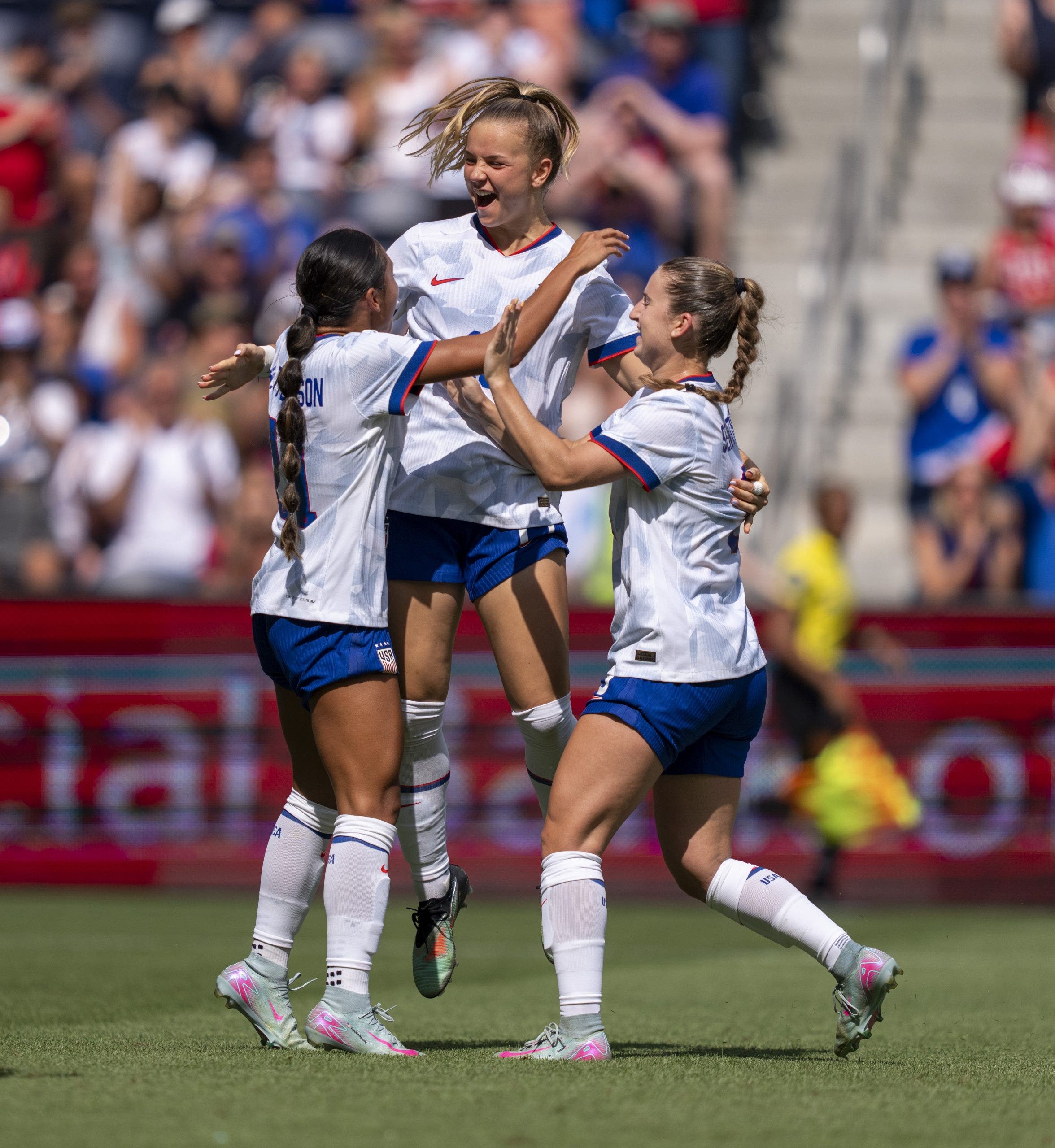Claire Hutton, one of the rising talents in the USWNT player pool, celebrates with teammates Alyssa Thompson and Ally Sentnor. (Photo by Brad Smith/ISI Photos/USSF/Getty Images)